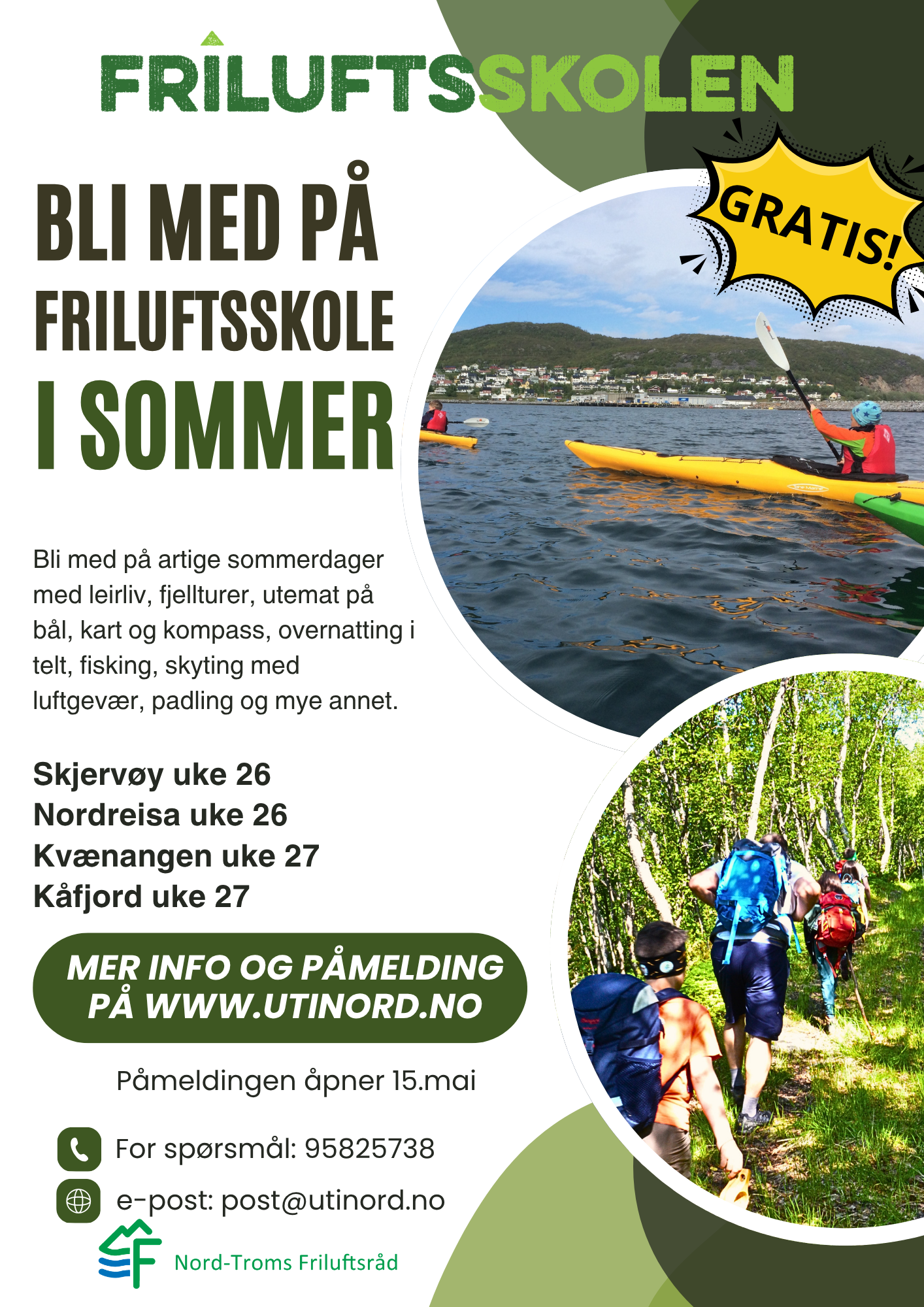 Nord-Troms Friluftsråd arrangerer i år Friluftsskoler i Nord-Troms. Her er oversikten over når de planlegges å gjennomføres.