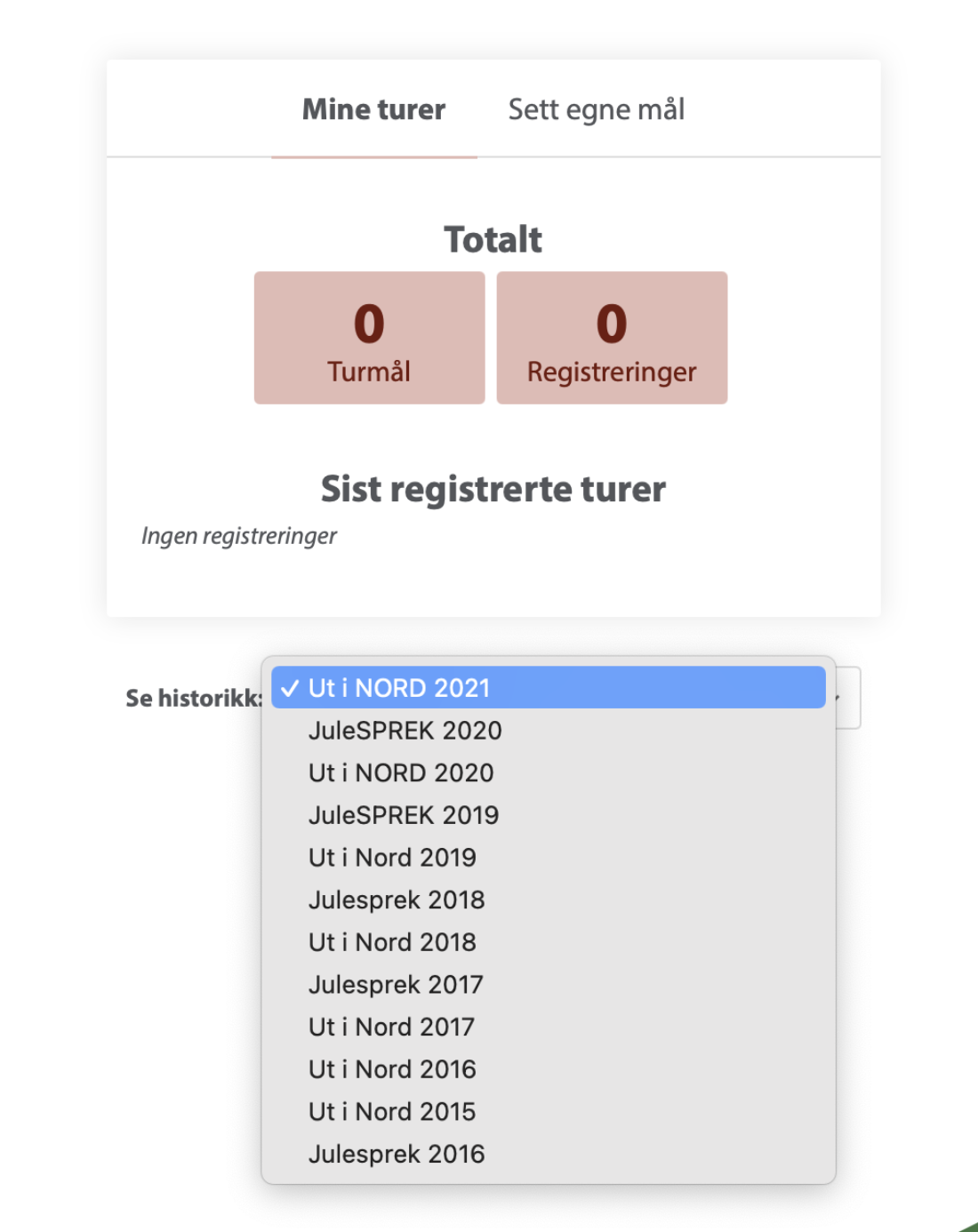 Årets JuleSPREK er avsluttet. Det betyr at det nå ikke er mulig å registrere turer før Ut i NORD åpner torsdag 13. mai (Kristi Himmelfartsdag). Kanskje du sliter med å finne oversikten over dine tidligere turer? Du kan søke tilbake helt siden oppstarten for Ut i NORD i 2020.